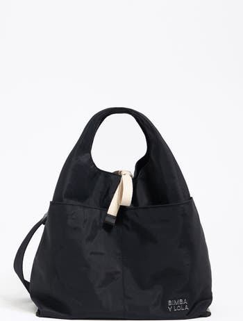 Small nylon handbag with two handles and an adjustable fabric strap, leather details, and a silver-tone metallic BIMBA Y LOLA logo. Features an interior pocket and branded fabric label.