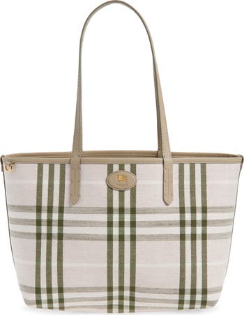 The house's Equestrian Knight—first seen on Burberry bags in the '80s—brands each side of this everyday-side tote that reverses from grainy calfskin leather to Burberry Check canvas in seasonal mallow pink. It comes with a detachable pouch so you can safely secure your smaller items.