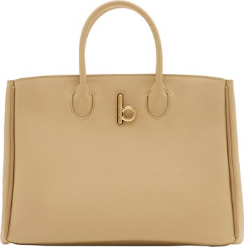 A softly structured tote made in Italy from grainy calf leather and lined in suede. The bag features our signature ‘b’ closure and a smooth calf leather panel embossed with the Equestrian Knight Design. A detachable strap switches the style from a handheld to a shoulder bag.||Detachable leather strap|Rolled leather top handles|‘b’ closure|Exterior slip pocket with magnetic closure, interior zip pocket|Hand-painted edges|Brushed metal hardware|Embossed Equestrian Knight Design at back|Calf suede lining|Comes with a dust bag