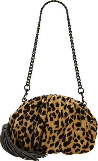 A swingy tassel adds a playful flourish to a leopard-patterned clutch that showcases a softly ruched silhouette equipped with a removable chain strap.