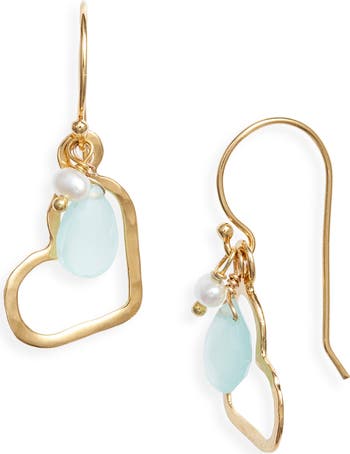 A hammered open heart dangles alongside a chalcedony and freshwater pearl charm on these dainty and romantic drop earrings.