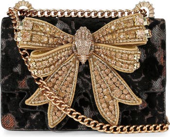 A bright crystal bow with an eagle-head center and velvety-soft fabric amplify the glam appeal of a compact crossbody bag featuring a divided interior and convertible chain strap.
