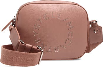 A studded logo and jacquard strap brand a compact bag made from the designer's supple faux leather in a balsam-inspired hue.