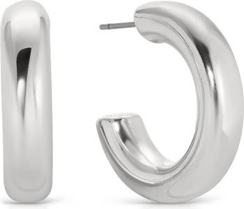 Small hoop earrings plated in polished 18-karat gold or rhodium complete any outfit with essential shine.