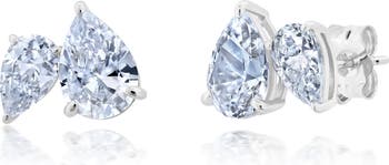 Hand-set cubic zirconia in pear-shaped cuts complement one another on these sparkling stud earrings plated in platinum or 18-karat gold.
