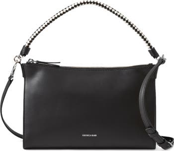 A slender profile underscores the sophisticated style of this smooth leather shoulder bag framed by a woven handle and removable, adjustable strap.