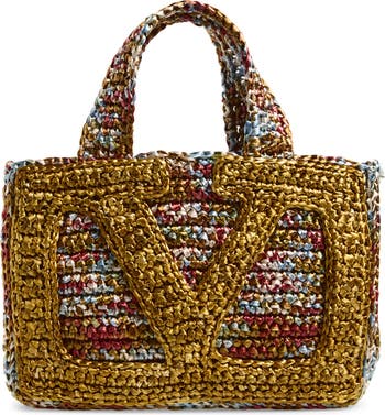 A house-signature VLOGO seems to pop in 3D from the front of this resort-ready straw tote crocheted in a dazzling palette of mixed colors.