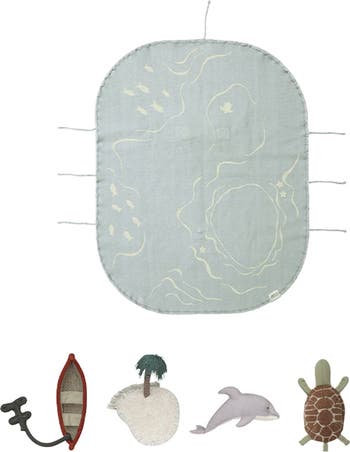 Kids can explore their own desert island with this handcrafted playset printed with fishes and a wavy pattern simulating the constant movements of the ocean.
