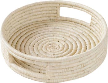 The perfect addition to any tabletop! This Small Woven Tray is handwoven using raffia by female artisans in Rwanda. We love this tray styled on a coffee table, as a catchall for your keys and wallet, or simply displayed as an accent piece in your favorite nook! 10" W x 3" H Natural color Made from locally sourced raffia Sturdy and lightweight design Double handles Also available in white sisal! The Small Woven Tray Raffia is great to give as a multi-use housewarming gift that is handmade by female artisans in Rwanda. *Due to the handmade quality, some size and color variation may occur.