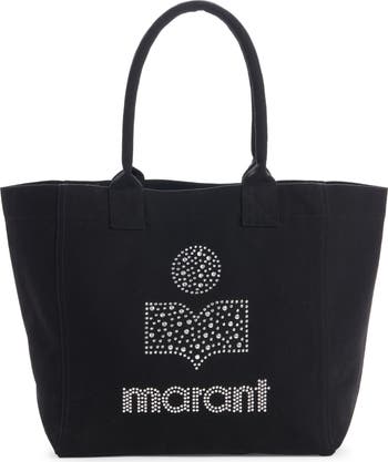 Modeled after the designer's childhood signature, a statement-scale logo outlined in silvery studs authenticates this soft cotton-canvas tote fitted with lightly padded handles for comfortable carry.