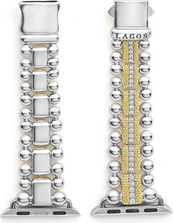 Turn your Apple Watch into a luxe jewelry piece with this two-tone bracelet featuring 18-karat gold Caviar beaded links dusted with pavé diamonds.