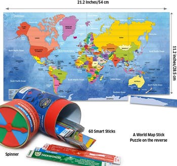 Learn facts about countries with 60 smart sticks in this fun-filled game. Assemble the sticks to build a puzzle on the reverse side!