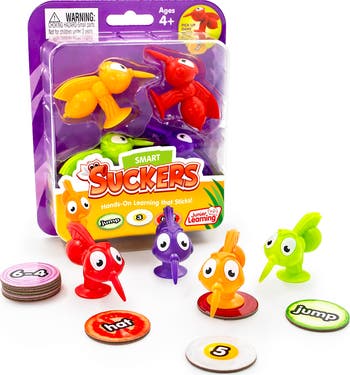 SMART SUCKERS - Hands-On Learning that Sticks! Turn learning into a fast-paced, interactive adventure with Smart Suckers! This set of four silly suction-cup mosquito toys makes picking up math, literacy, or game tiles fun and engaging, transforming ordinary practice into a hands-on experience that motivates children to focus, think quickly, and develop fine motor skills. GAME PLAY: Kids can use Smart Suckers to grab answers, spell words, or complete challenges, making every lesson a playful and interactive activity. FUN FOR HOME OR CLASSROOM: Ideal for classroom games, learning centers, or home practice, Smart Suckers keep children excited, confident, and eager to learn every day. Durable, lightweight, and easy to use, this set encourages coordination, focus, and speed while reinforcing key math, literacy, and problem-solving skills. Whether used individually or with other educational tools, Smart Suckers make learning dynamic, hands-on, and irresistibly fun, turning every activity into an opportunity for children to engage, explore, and succeed. Designed to work with any flat, lightweight pieces, they pair perfectly with Junior Learning Snacks tiles (sold separately), which include 90 educational tiles covering multiple topics.