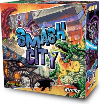 Smash City is the action-packed game of Kaiju combat! Toss your giant monster dice at your foes to perform devastating attacks! Crush cities and spread fire, electricity, poisonous gas and radiation! Throw cars and destroy tanks! Inflict maximum carnage like a true Kaiju! Players must have good aim and a deft hand as they roll their monster dice into the city knocking down buildings and attacking anything within range. You might even be able to throw cars at your foes! Each of the four Kaiju has special powers and each favors a particular energy type. Use these to crush your foes and smash the city! Players gain SMASH! cards as they destroy the city and will have to use their cards and powers to full effect if they hope to overcome their foes and be the victor of Smash City!