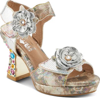 Faceted jewels and metallic floral appliqués add regal elements to an opulent platform sandal designed with an adjustable ankle strap to ensure a secure fit.