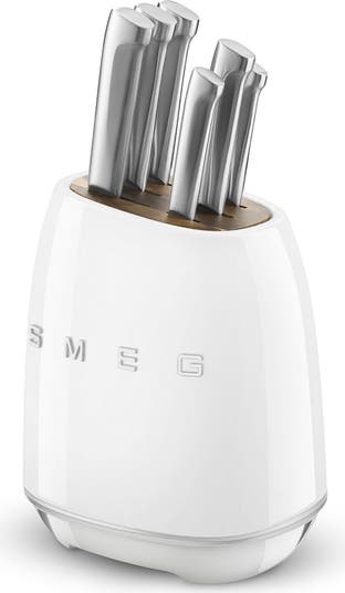 Additional features: The six included knives come with a six-slot acacia-wood knife block set within a powder-coated carbon steel casing with antislip feet and Smeg's iconic retro look.