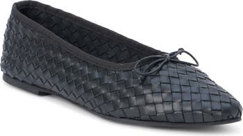 A delicate bow and grosgrain topline highlight the finely woven upper of a leather flat featuring a snip toe that furthers the streamlined silhouette.