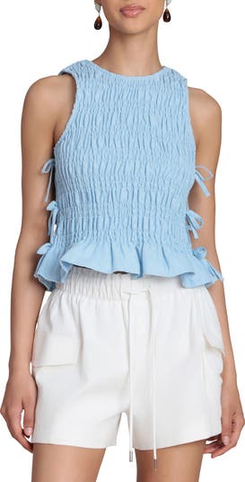 Sweet smocking and a flirty flouncy animate a summery, side-ruched top cut from a linen-forward blend.