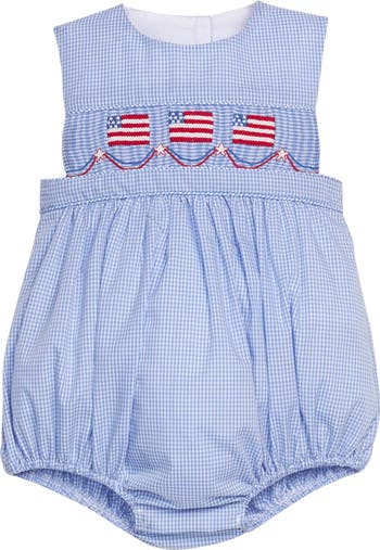 Our Smocked Apron Bubble for baby boys features hand-smocking and wide cut sides to make this a breezy option for summer weather.
