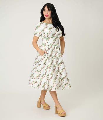 This stunning spring swing dress is crafted in a lightweight woven fabric. The modest neckline is framed by short sleeves, while the scoop back is secured by the back zipper. The wide waistband features a smocked back, while the full swing skirt has pockets hidden in the seams!