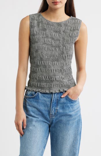 Made from a cotton-linen blend, this striped bateau-neck tank is fully smocked and detailed with a ruffled hem. Designed to hug the body, it elevates any look.