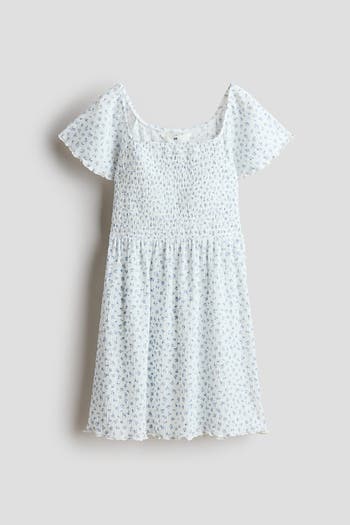 Dress in crinkled jersey with a flared skirt. Square neckline, smocking at front of bodice, and butterfly sleeves. Overlocked edges at cuffs and hem.