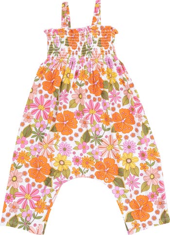 A smocked bodice and frilly trim make this printed romper the perfect piece for baby to wear on a sunny day.