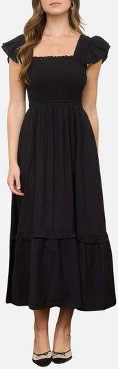 A smocked bodice and a flouncy tiered skirt sweeten the silhouette of this square-neck maxi framed by fluttering sleeves.
