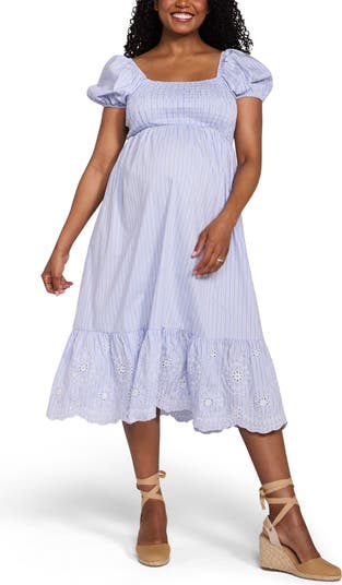 This puff shoulder smocked midi dress combines effortless style with ultimate comfort, featuring a flowing silhouette, charming puff sleeves, and a smocked top for a perfect fit throughout pregnancy. Crafted from soft, breathable fabric, this versatile dress is ideal for both casual outings and special occasions.