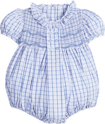 - Our Smocked Bridget Bubble features puff sleeves, a ruffled collar, and smocking through the chest with a center button placket.