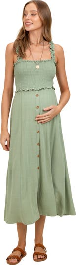 Effortlessly chic and oh-so-comfortable, our Smocked Button Front Linen Blend Maternity Midi Dress is your go-to for everyday elegance. The smocked bodice hugs your curves just right, while the airy linen-blend fabric keeps you cool all season long. Featuring functional buttons for nursing convenience and an on-trend hue, this midi dress transitions seamlessly from bump to baby and beyond. Pair it with sandals or sneakers for a timeless, versatile look you’ll reach for again and again!