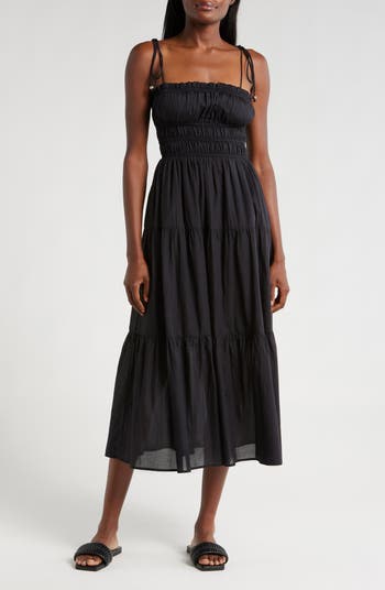 A stretchy smocked bodice shapes a vacation-ready midi dress that will take you from the beach to dinner in effortless style.