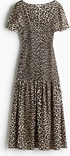 Ankle-length dress in a viscose-blend weave with a boat neckline, keyhole opening with a button at the back of the neck and short sleeves. Smocked section from the bust extending below the hips creating generous gathers at the top and bottom. Unlined.
