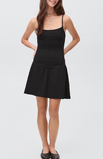 A smocked bodice gives way to a dropped waist and flared skirt in this stem-baring dress cut from pure, breathable cotton.