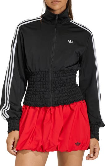A stretchy smocked waist and cuffs sweeten this tried-and-true track jacket boasting signature 3-Stripes down the sleeves.