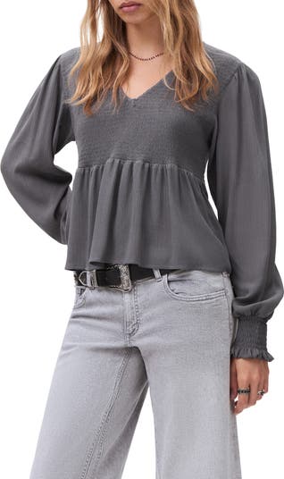 Sweet smocking creates a close-fitting silhouette on this puff-sleeve top punctuated with a flowy, babydoll hem for flouncy movement.