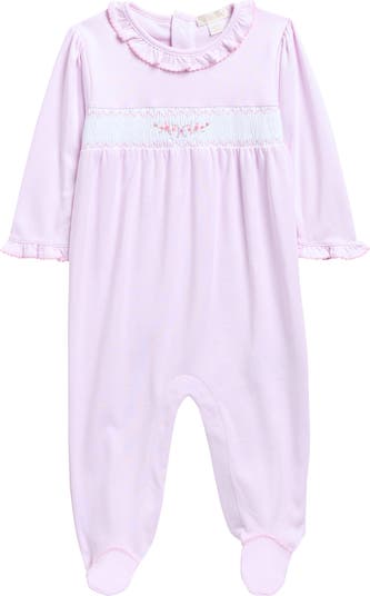Tiny flowery embroidery sweetens the smocked chest of a cozy footie cut from soft pima cotton and finished with frilly ruffle trim.