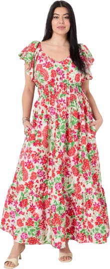 Max out on eye-catching details with this maxi dress featuring a front V-neck, flutter sleeves, and a smocked empire waist. This dress instantly becomes a versatile warm-weather favorite made from lightweight, breathable and wrinkle-resistant poplin. Elasticized waist, back neck and shoulder cuff. On-seam pockets.