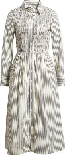 Coming in a crisp cotton poplin, this pinstriped midi shirtdress features a point collar, smocked bodice and A-line skirt. Elevated and effortless, it's finished with buttons down the front.