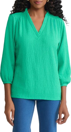 Made with a softly puckered texture, this classic desk-to-dinner top has a ruffled collar and smocking at the shoulders.