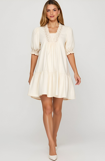 A soft, flowy silhouette defines this mini dress, finished with a delicately embroidered neckline for an artisanal touch. The smocked puff sleeves add texture and shape, while the tiered hem creates easy movement. Side pockets bring a casual functionality, balancing its feminine details. Lightweight and relaxed, this dress is ideal for effortless styling with sandals or boots.