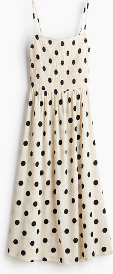 Calf-length dress in crinkled jersey with a smocked bodice, square neckline and adjustable spaghetti shoulder straps. Gathered seam at the waist and a flared skirt.