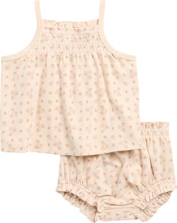 Your tiny trendsetter will look adorable without compromising on comfort in this fresh, breathable organic-cotton set featuring a smocked tank and matching ruffle-trim bloomers.