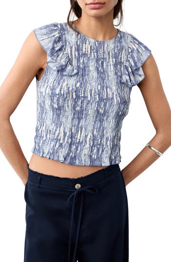Sweet smocking creates a close-fitting silhouette on this flutter-sleeve top punctuated with a cropped hem for flouncy movement.