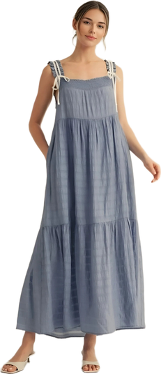 The Knit & Lounge Blue Smocked Maxi Dress offers an effortlessly feminine silhouette with its airy, tiered skirt and smocked bodice. Finished with delicate tie straps, this breezy maxi is perfect for warm days or relaxed evening outings.