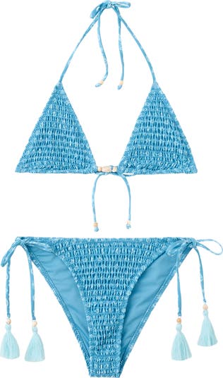 Smocked cups lend dimension to this bead-trimmed bikini top cut in a classic triangle silhouette.
