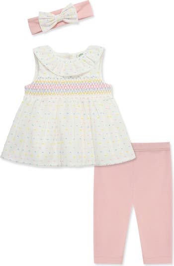 A sweetly smocked cotton tunic pairs perfectly with stretchy leggings and a coordinating headband that will have baby ready to face the day in style.