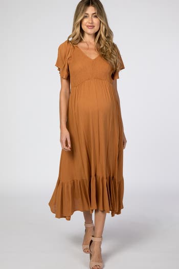 Effortlessly chic and comfortable, our Smocked V-Neck Maternity Midi Dress is a must-have for modern moms-to-be. Featuring a flattering smocked bodice, feminine v-neckline, and flowy midi-length skirt, this dress highlights your growing bump while providing all-day ease. Soft, lightweight fabric and stretchy design make it perfect for every trimester. Dress it up with heels or keep it casual with sandals—ideal for baby showers, brunch, or everyday wear. You’ll love how confident and beautiful you feel in this timeless maternity piece!