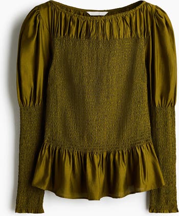 Fitted blouse in a viscose-blend weave with a slight sheen. Features a boat neckline with covered elastication, a smocked bodice with a frill-trimmed hem, long puff sleeves with smocking from the elbow down and frill-trimmed cuffs.