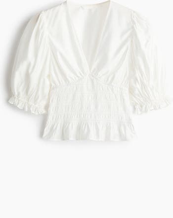 Short blouse in woven fabric made from a viscose blend. Deep V-neckline, a smocked section at the waist and short puff sleeves with frill-trimmed cuffs.